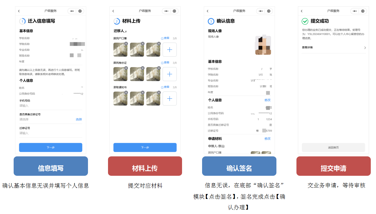 2、学生迁入申请操作说明,请按步骤提交资料(服务处所填:XXXX级航海学院)。